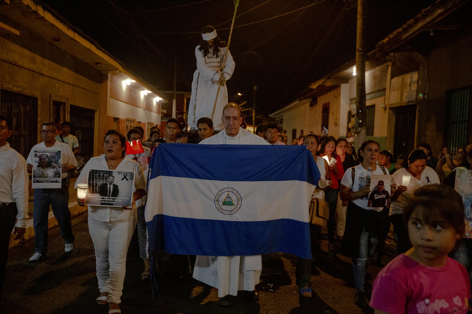 Padre Edwin Román, parroco della Chiesa San Miguel, a Masaya, il 18 aprile ha portato una bandiera del Nicaragua, durante la processione del silenzio che si effettua il giovedì santo. Alla processione hanno partecipato anche i familiari dei morti e dei prigionieri politici. A seguito del lavoro umanitario che Román realizza, ha ricevuto minacce di morte, è per questo che da giugno dell’anno passato possiede misure di tutela da parte della Commissione Interamericana dei Diritti Umani (CIDH).