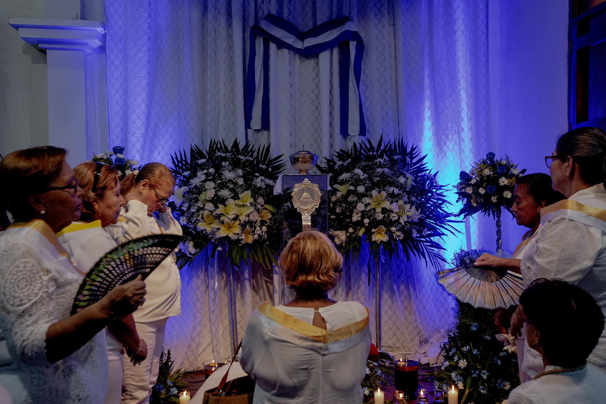 Fedeli pregano e fotografano l’altare del santissimo nella Chiesa San Miguel, di Masaya. Padre Edwin Román ha decorato l’altare con la bandiera e lo scudo del Nicaragua, simboli utilizzati durante le proteste contro il regime di Ortega. Alcuni fedeli affermano di subire costantemente persecuzioni poliziesche e altri dicono di aver anche dovuto abbandonare le proprie case.