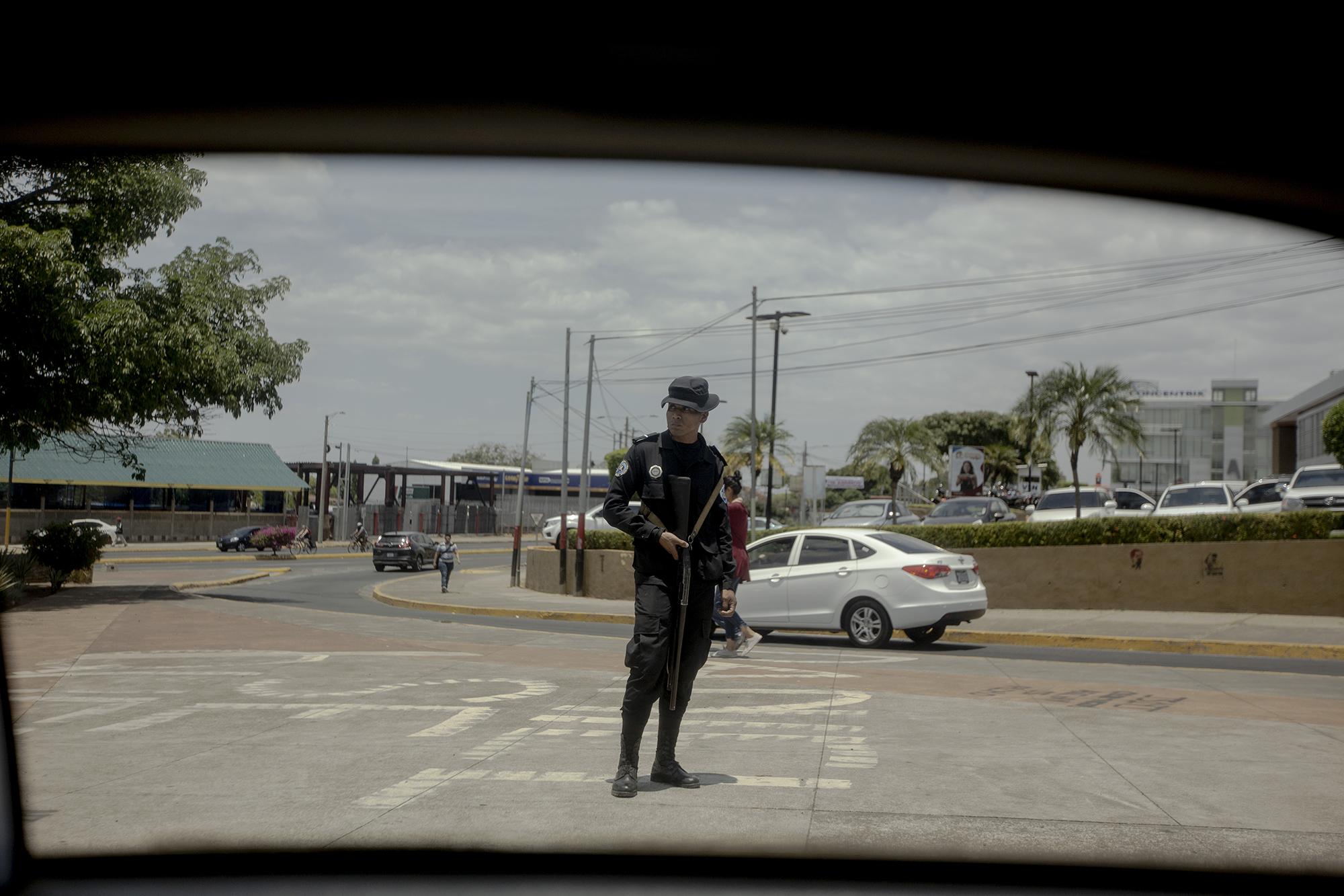 Un poliziotto nelle vicinanze del monumento al pugile Alexis Argüello, nella città di Managua. Il 17 aprile, il governo nicaraguense ha dispiegato un forte dispositivo poliziesco per evitare che si effettuassero proteste commemorative del primo anniversario della crisi che ha ora lasciato un saldo di 400 morti. A dicembre scorso, la CIDH ha stabilito che la polizia aveva represso la popolazione con armi da guerra.