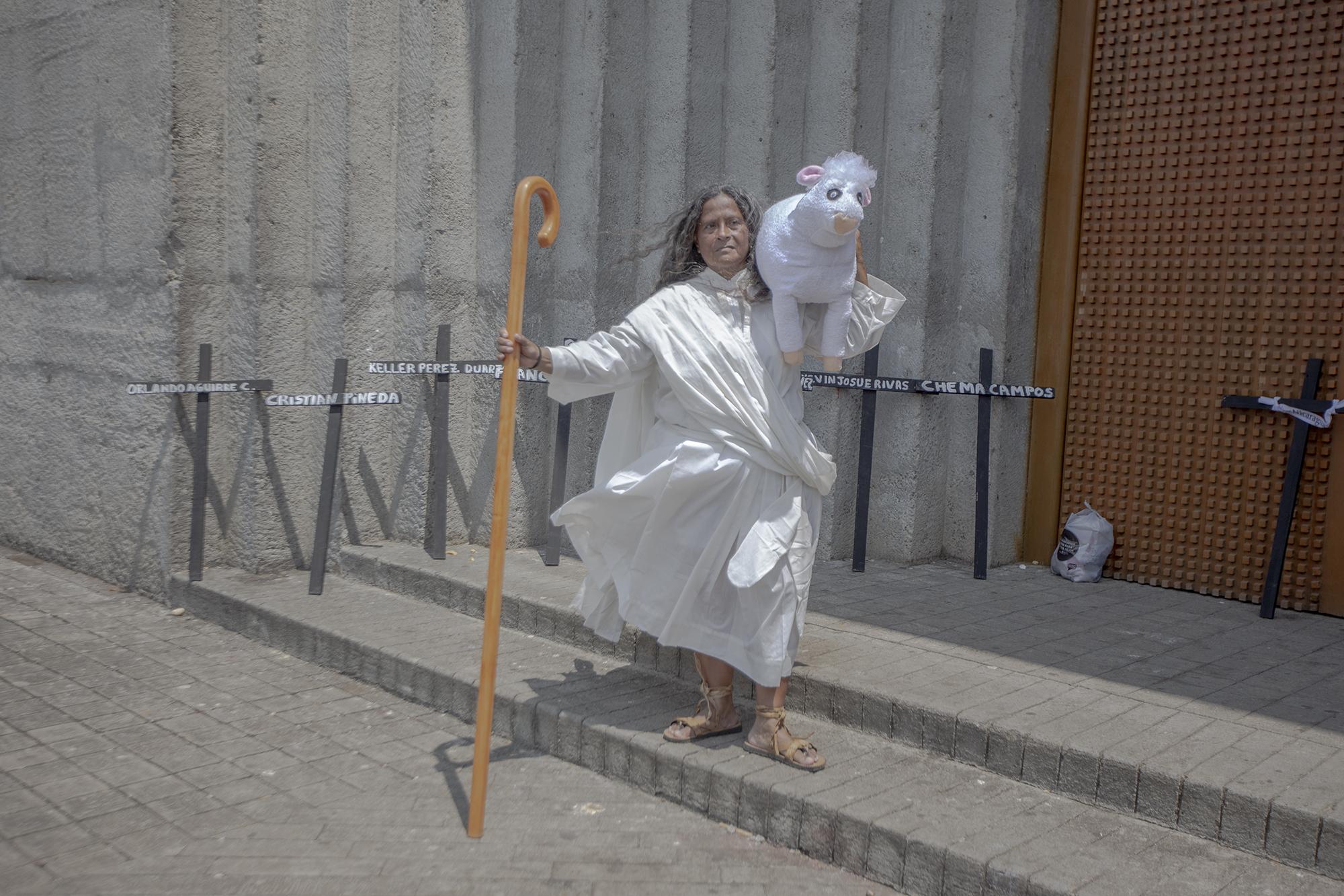 Il venerdì santo, croci nere con i nomi di alcune delle vittime sono state utilizzate come forma di protesta durante la via crucis fuori della cattedrale di Managua. Rosa María, nelle vesti del pastore dell’abbondanza, posa di fronte alle croci.
