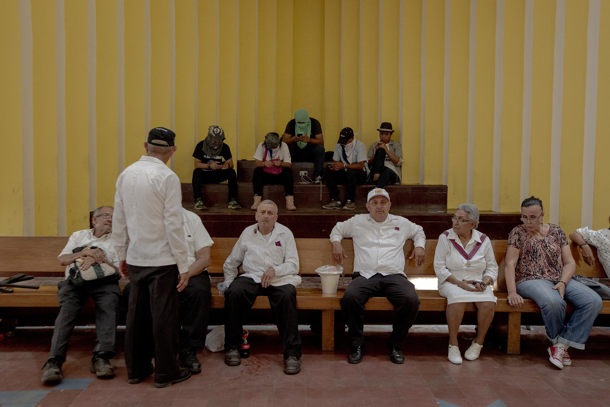 Dei giovani manifestanti gridano parole d’ordine all’interno della cattedrale. Esattamente un anno fa, poliziotti e turbe della Gioventù Sandinista attaccarono i manifestanti che si trovavano all’interno del recinto. La cattedrale servì per dare i primi soccorsi ad alcuni feriti.